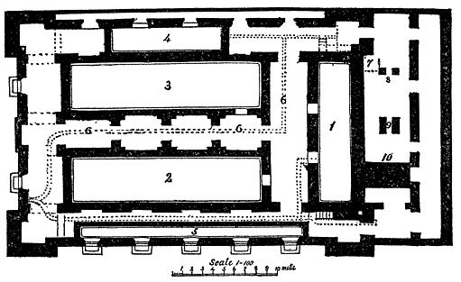 Plan of Basement. 1. West reservoir; 2. South reservoir; 3. North reservoir; 4, 5. Storage basins; 6. Pipes connecting the reservoirs and basins with the pump; 7. Pump-reservoir; 8. Pumps; 9. Engine; 10. Boiler.